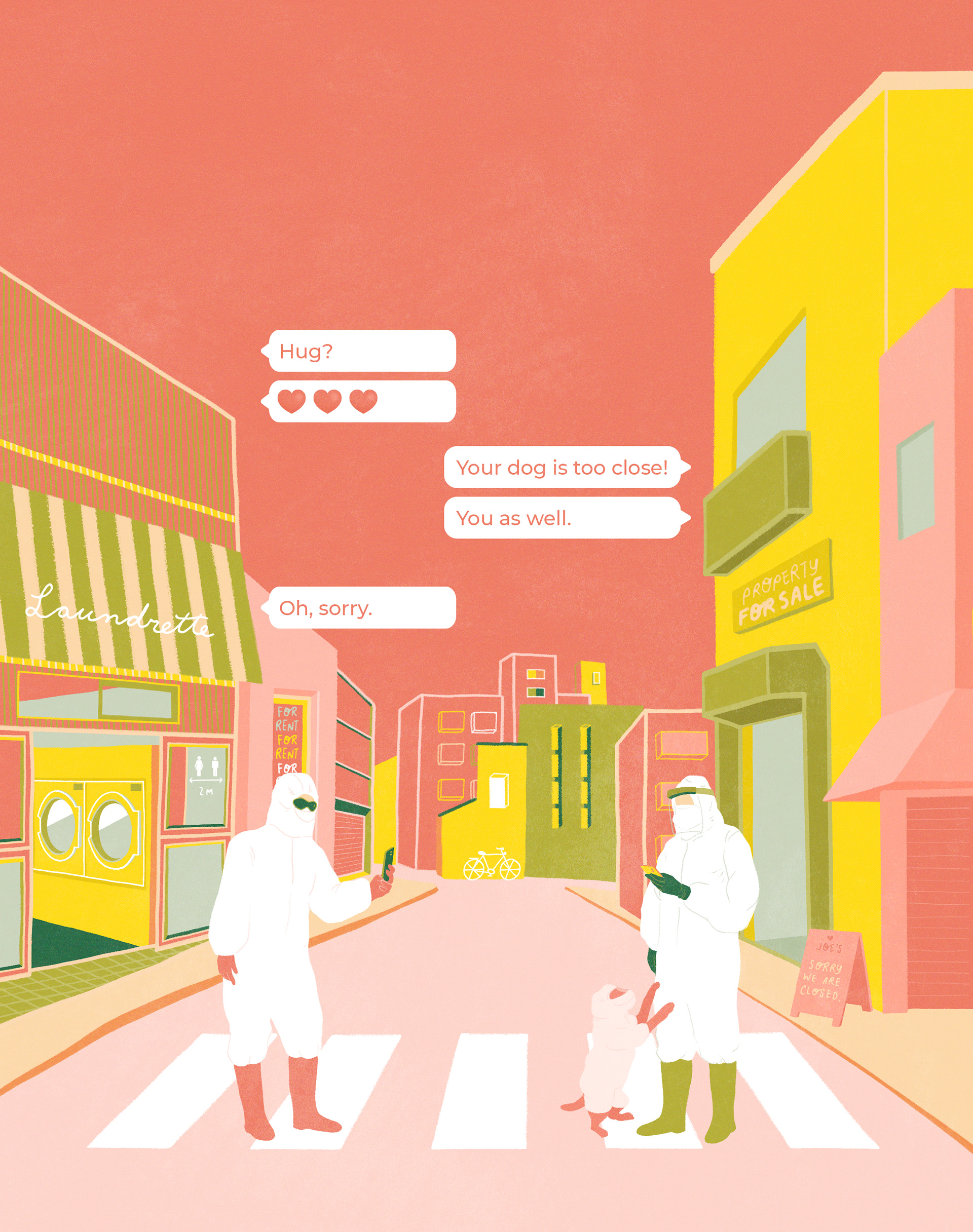 Illo 1: Two friends are interacting on an empty street.