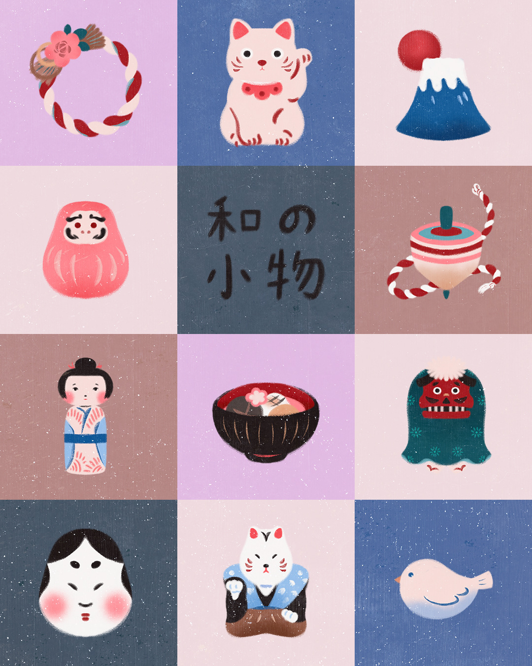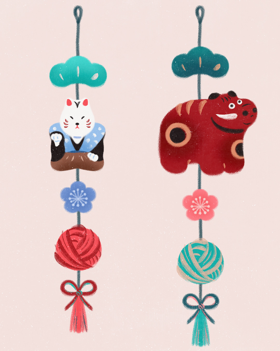 A collection of Japanese folk crafts and New Year celebration objects, inspired by a journey to Kyoto